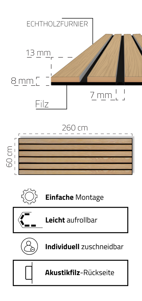 Erleben Sie die natürliche Schönheit der Golden Wood-Paneele. Ihre warmen, goldenen Holztöne und die feine Maserung verleihen Ihrem Raum eine behagliche, elegante Ausstrahlung. Mit hochwertigen Materialien und sorgfältiger Verarbeitung bleiben diese Wandverkleidungen über Jahre hinweg widerstandsfähig und pflegeleicht. Die Vielseitigkeit der Golden Wood-Akustikpaneele macht sie ideal für unterschiedlichste Anwendungen – von gemütlichen Wohnzimmern bis zu stilvollen Arbeitsräumen. Genießen Sie die harmonische Wirkung dieser Paneele, die Ihren Raum in eine Welt aus Wärme und zeitloser Eleganz entführt.